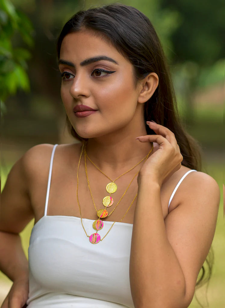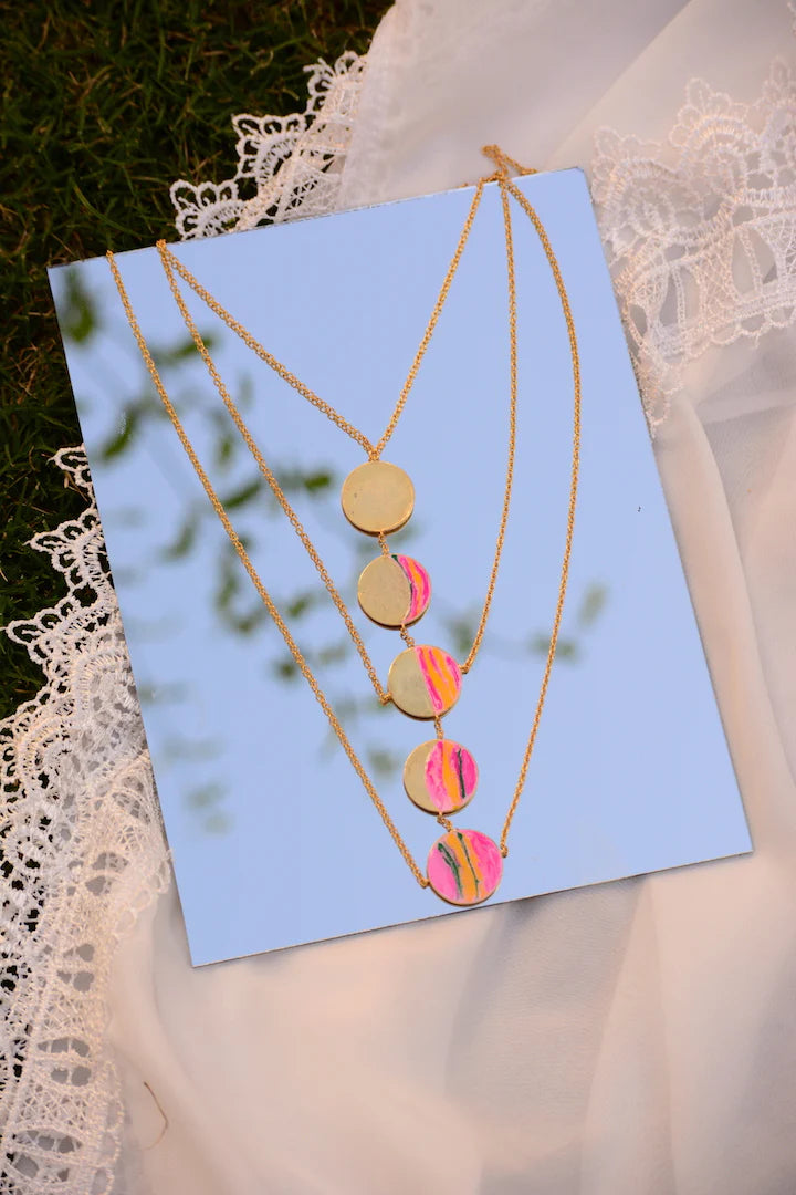 With this statement neckpiece, layering just got easy. Every layer is inspired by phases of the moon, mixed with playful colours.