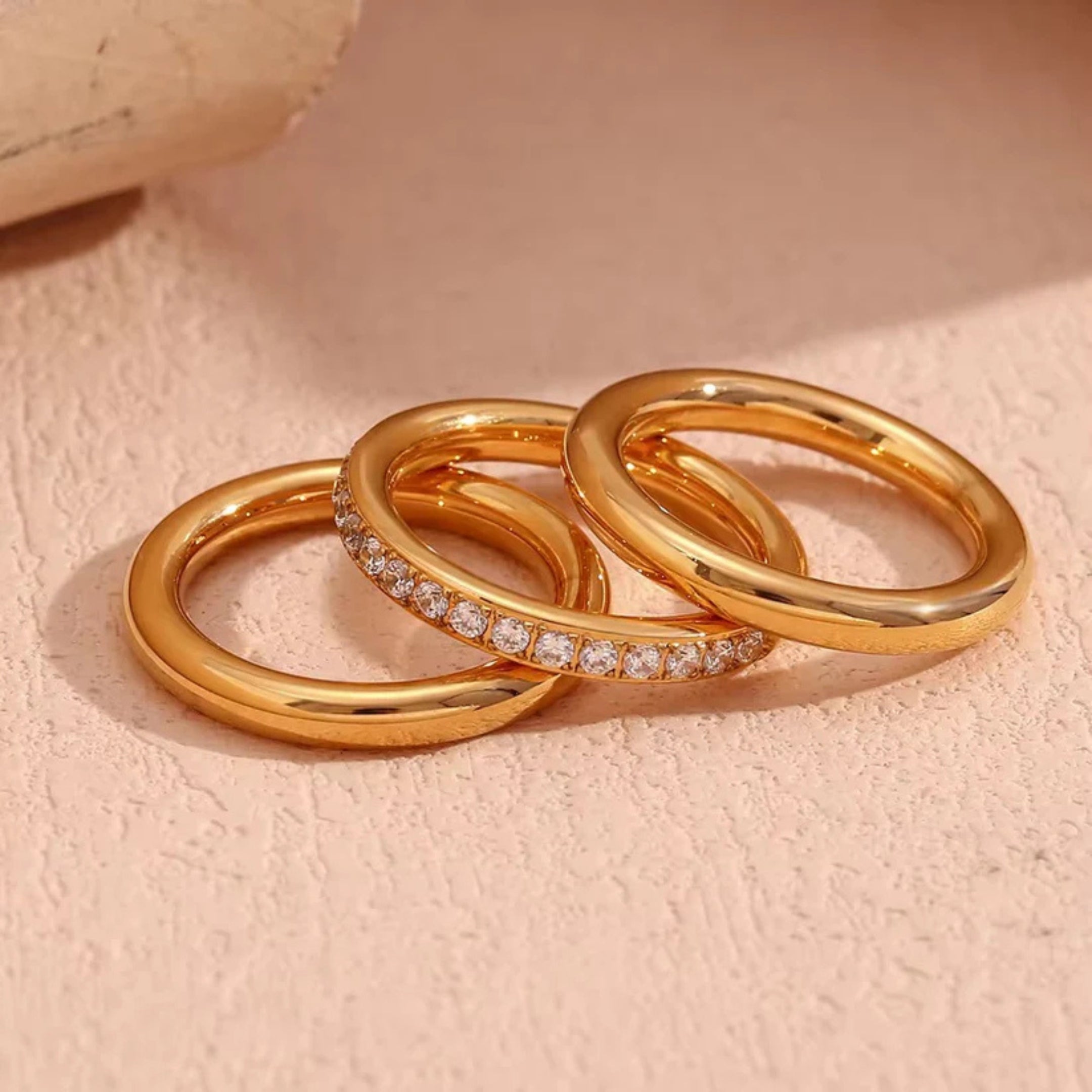 A Set of 3 Rings with two solid golden bands and one studded with zircon diamonds. These rings are waterproof which makes them a great accessory for everyday styling.
