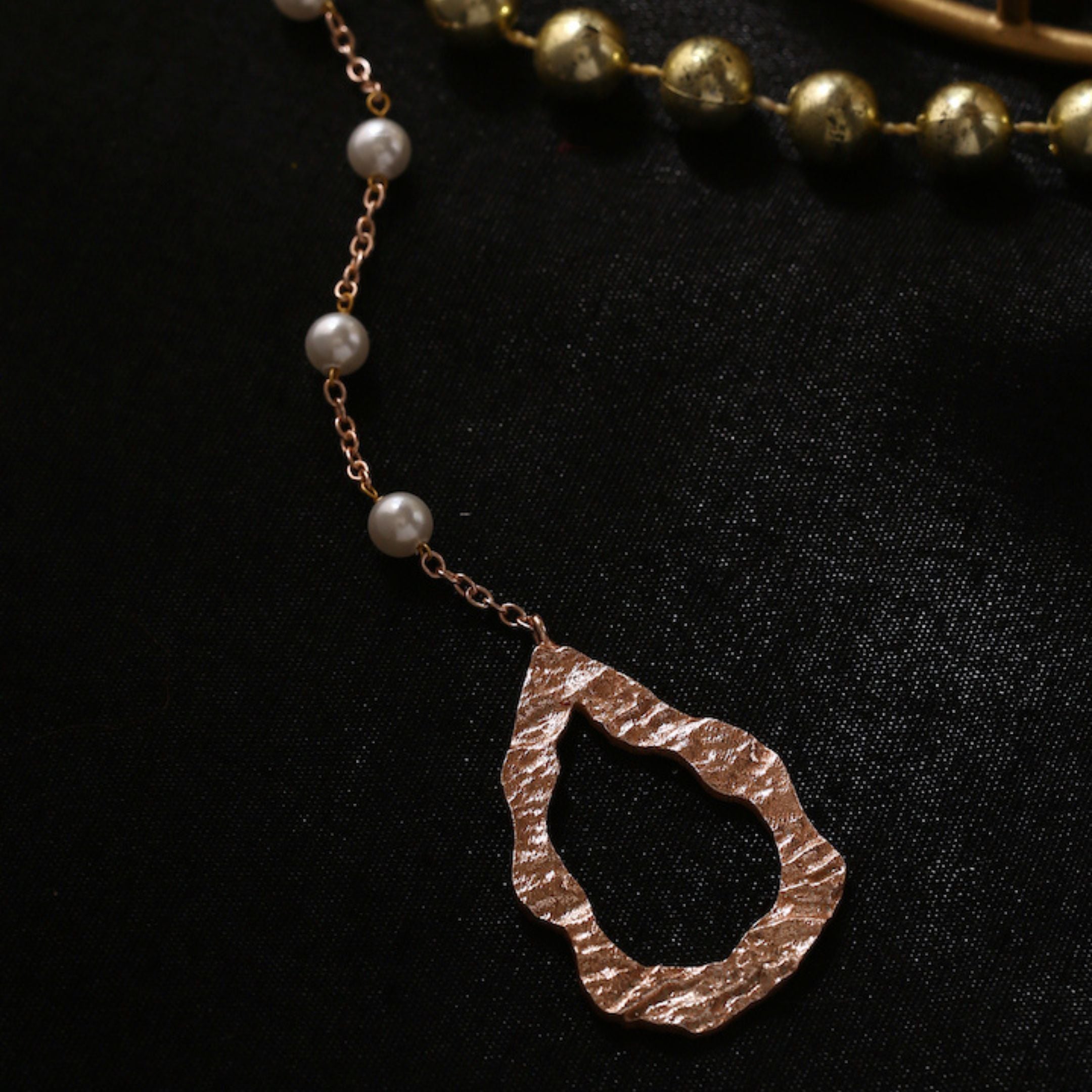 Grace drips in gold with the Golden Dew Headgear — a stunning blend of textured artistry and soft elegance. Inspired by morning dew glistening on petals, this piece features delicately linked pearls cascading through a chain of molten-textured gold. Each droplet-like design reflects natural beauty with a touch of opulence, making it the perfect accessory for those who adore subtle luxury. Whether paired with traditional attire or modern ensembles, it adds an ethereal glow to your look — just like golden dew at dawn.